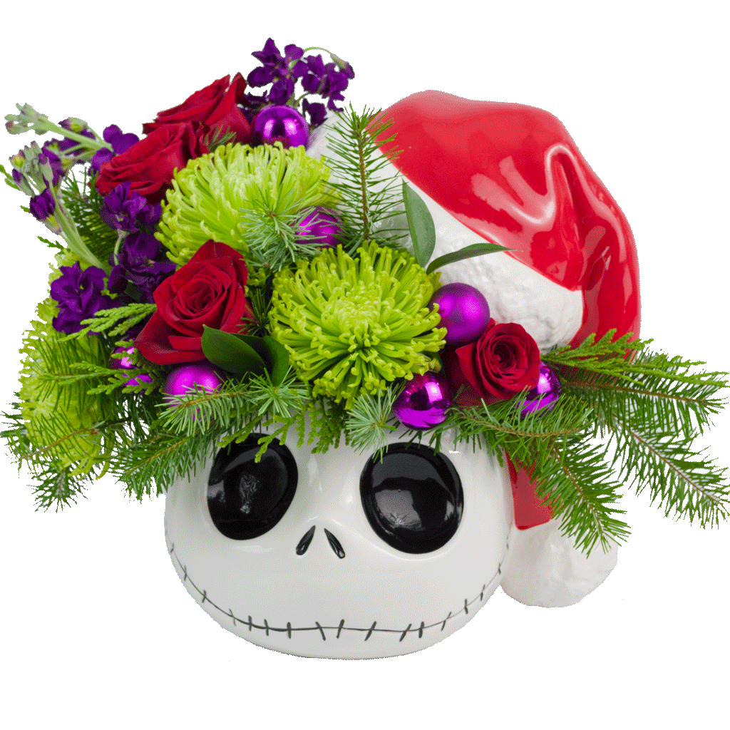 This spooktacular Christmas Nightmare Cookie Jar Bouquet is just the trick for you to give as a treat. As you can see, Jack Skellington has added some floral adornment to his holiday outfit, including green pine, green spider mums and premium blood red roses.