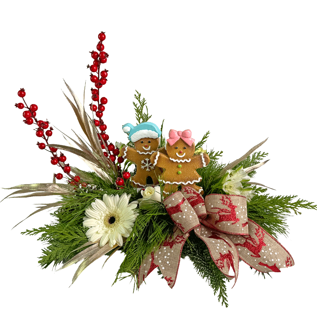 Celebrate the sweetness of the season with the Gingerbread Christmas Bouquet, a festive arrangement bursting with holiday charm. Nestled in lush winter greens, two adorable gingerbread figures steal the show, surrounded by crisp white blooms, cheerful red berry accents, and elegant metallic foliage.