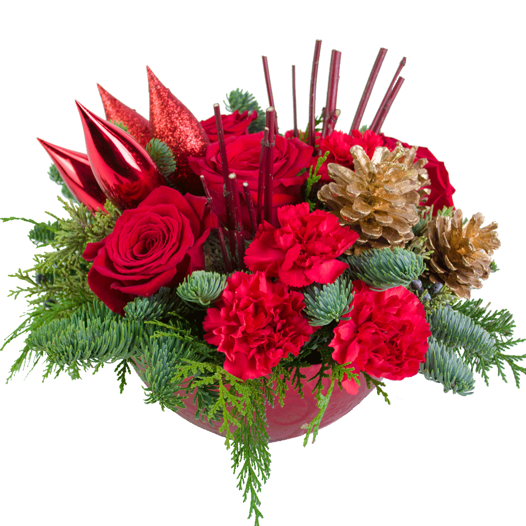 Bring warmth and tradition to your Christmas décor with the Holiday Charm Bouquet. Featuring a vibrant mix of lush evergreens, rich red roses, and cheerful red carnations, this design is nestled in a festive red bowl imported from Holland. Adorned with sparkling ornaments, it’s the perfect centerpiece to add a classic and elegant touch to your holiday celebrations.