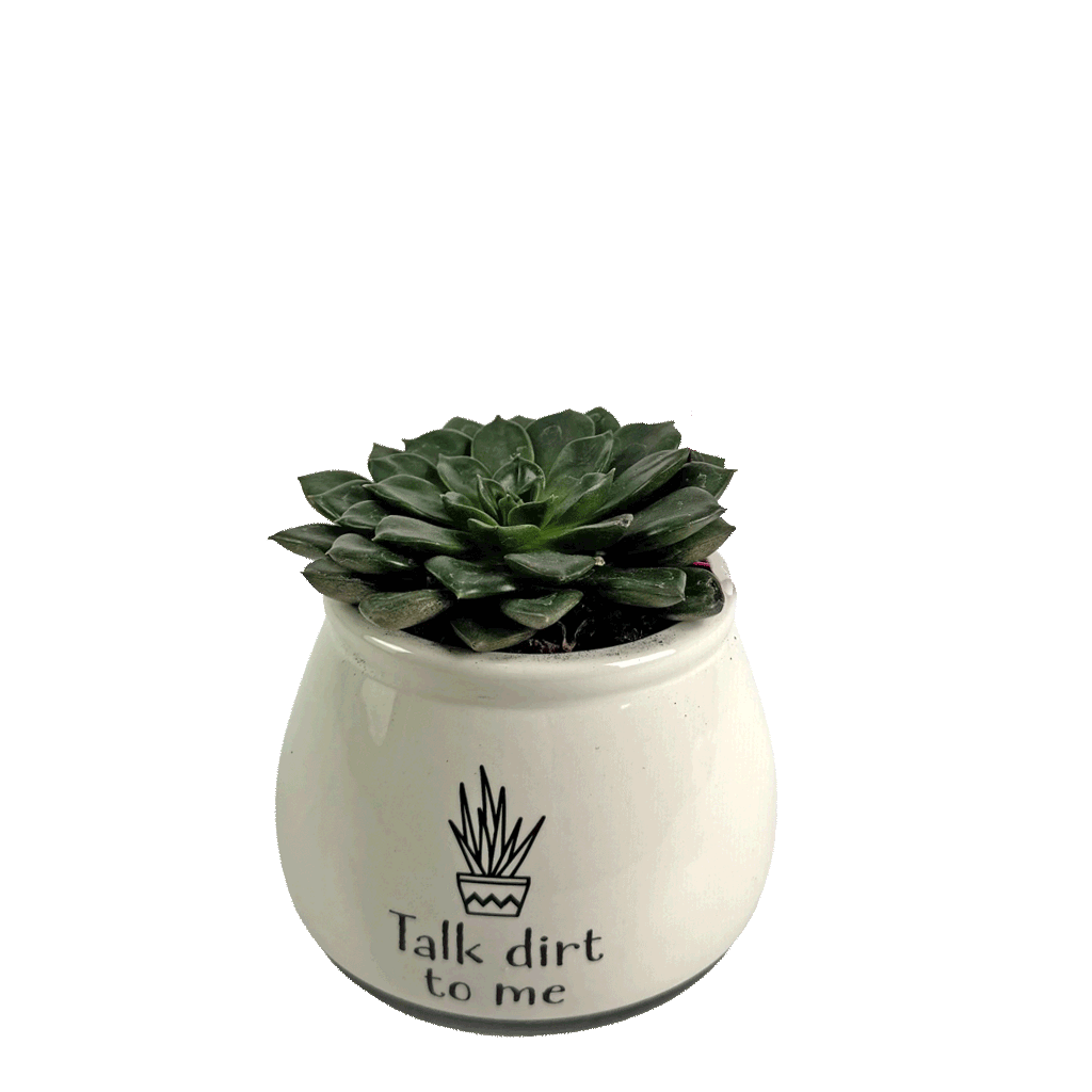 Say “I love you” with a gift that lasts. Our Love Grows Here Succulent is a charming and modern plant gift, perfect for plant lovers and romantics alike. This easy-care succulent is nestled in a glossy white ceramic planter featuring the playful phrase “Talk dirt to me.”