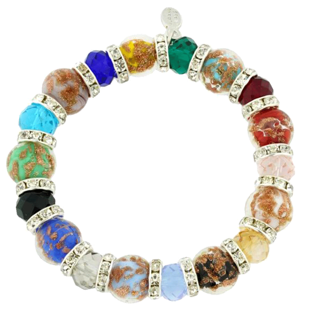 This multicolored bracelet is hand made in Venice, Italy using the Murano Style. Their glass master artisans create each bead by hand. Each bead has a mineral called “aventurine” blown into the glass to add a beautiful sparkle. Crystal spacers in between the colorful glass beads.