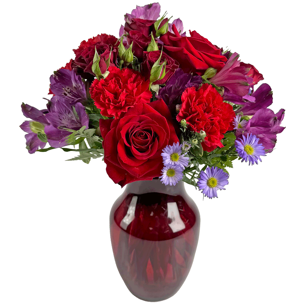 The Love & Devotion Bouquet is a heartfelt expression of romance and admiration, artfully designed in a rich ruby red vase. Featuring premium red roses as the focal point, this arrangement is beautifully accented with vibrant red carnations, graceful alstroemeria, and delicate lavender asters for contrast and texture.