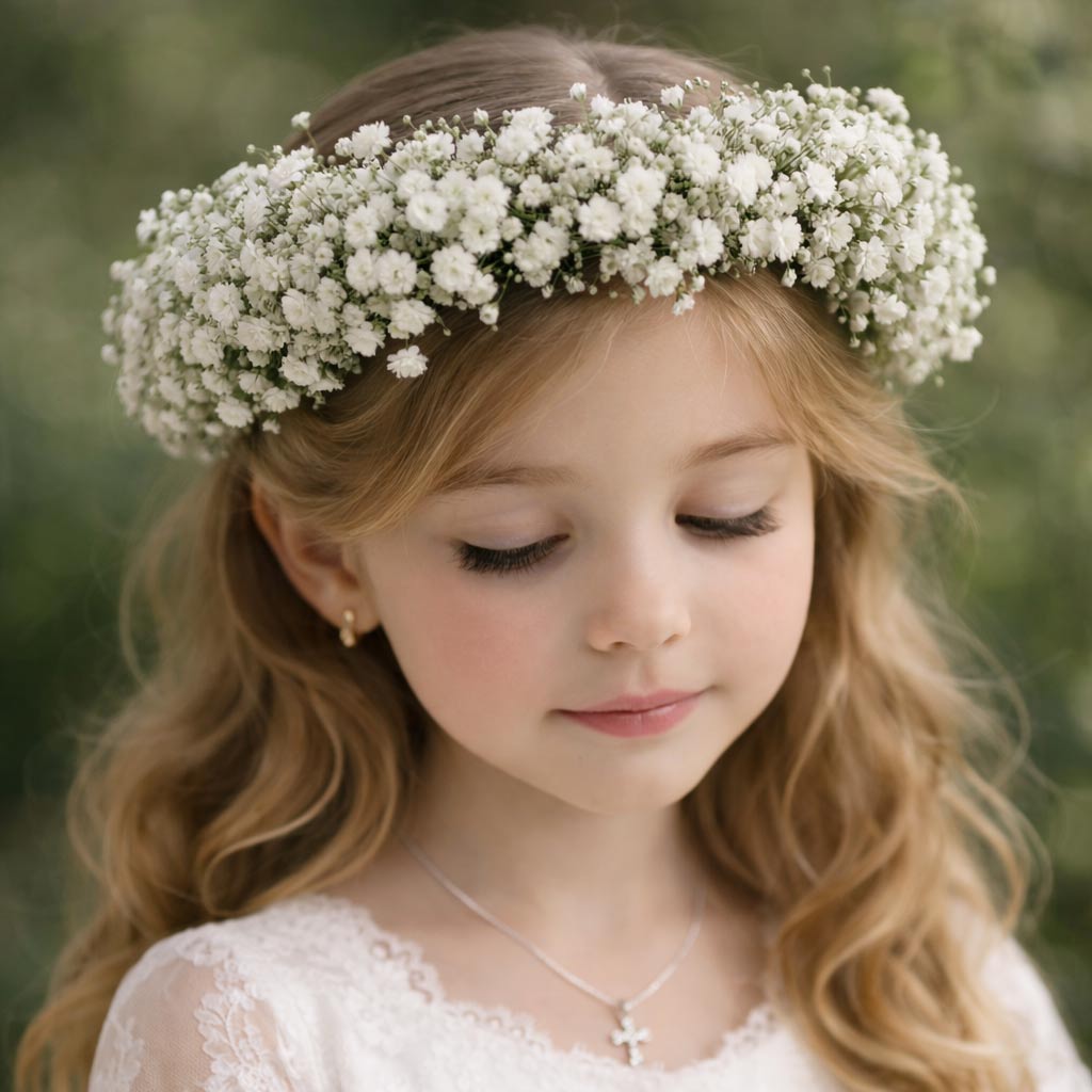 Honor a sacred milestone with this beautifully handcrafted Baby’s Breath Head Wreath, a timeless symbol of faith, purity, and spiritual growth. Designed with delicate clusters of fresh baby’s breath, this elegant wreath creates a soft, cloud-like texture that feels both peaceful and reverent, perfect for a flower girl, or for celebrating a First Communion ceremony.